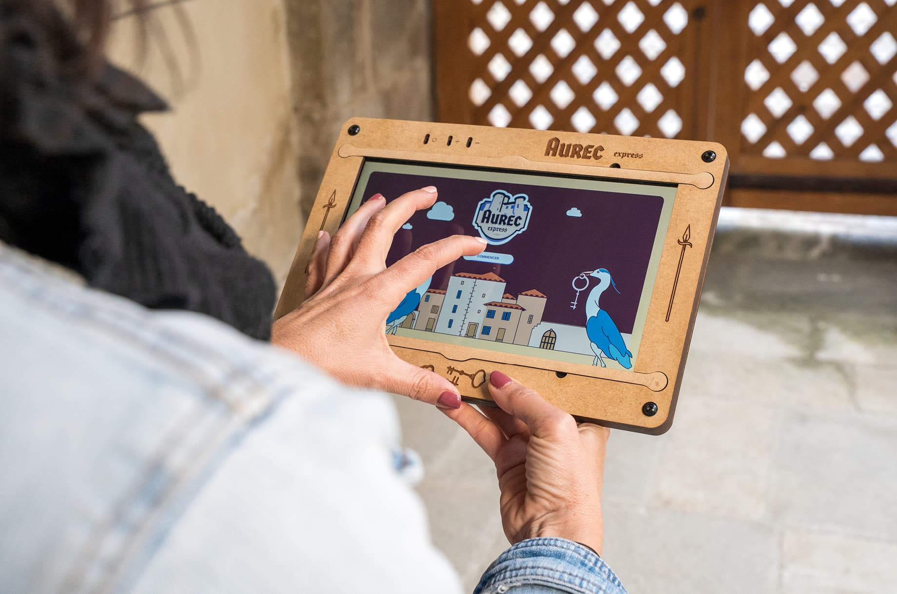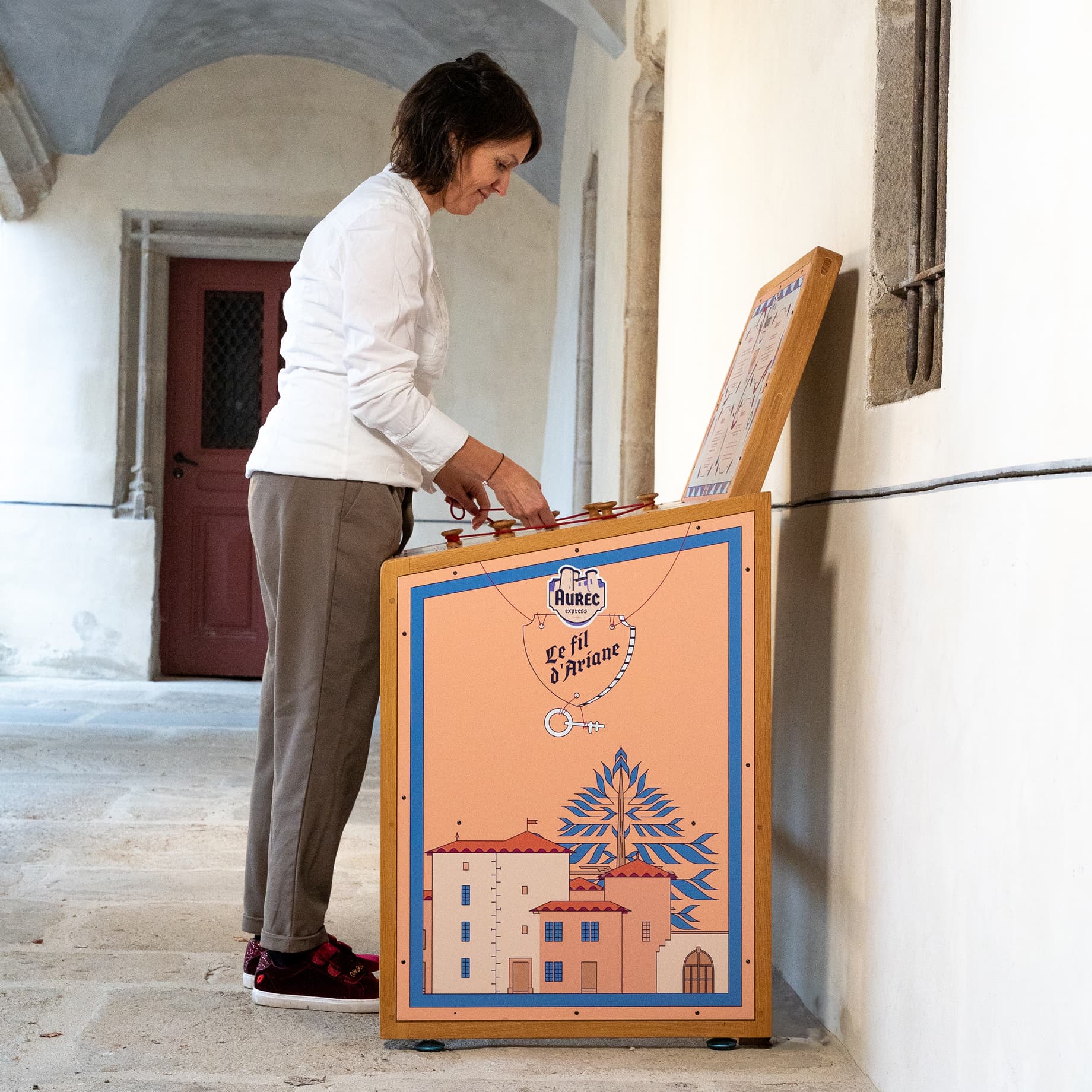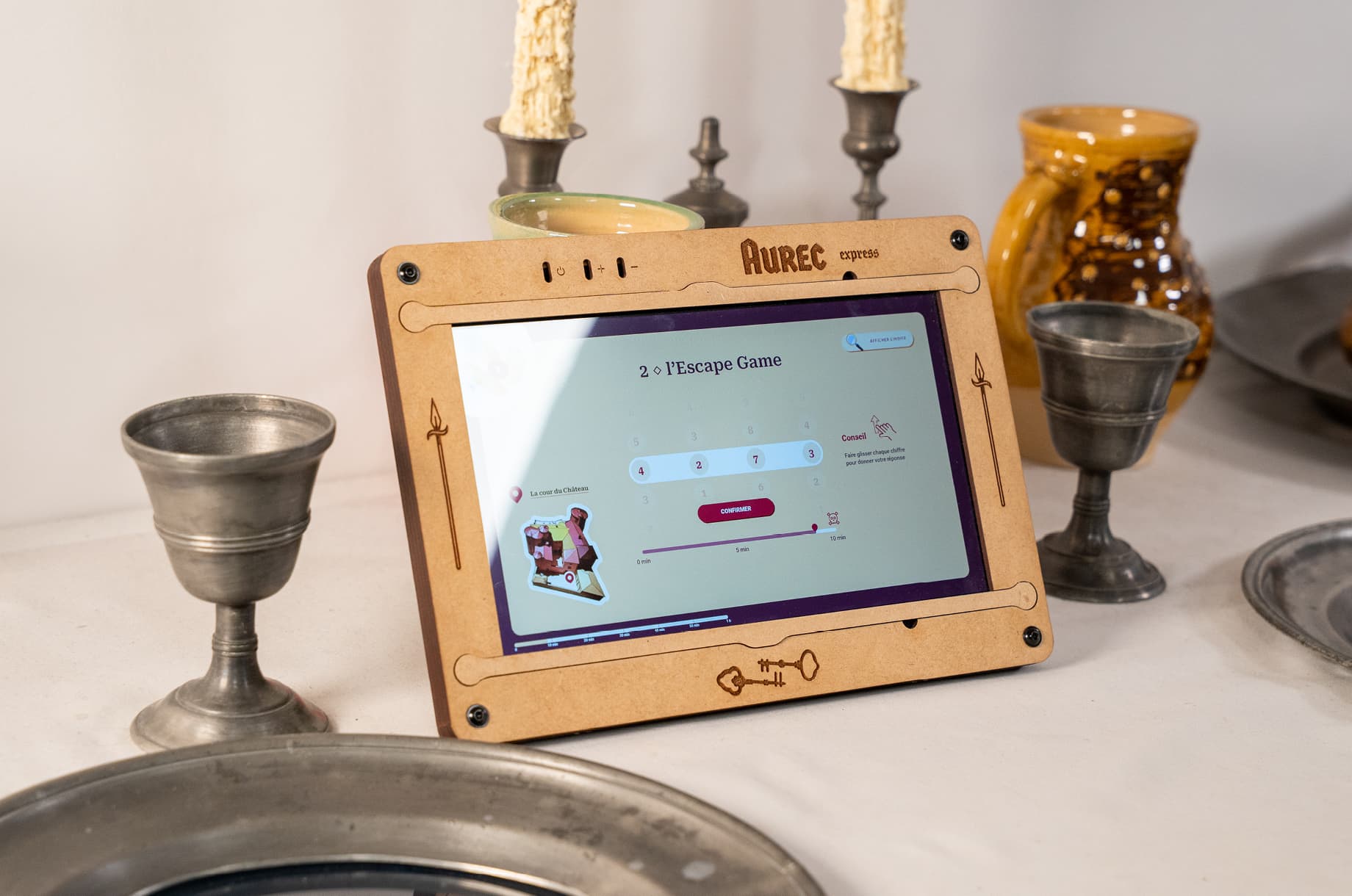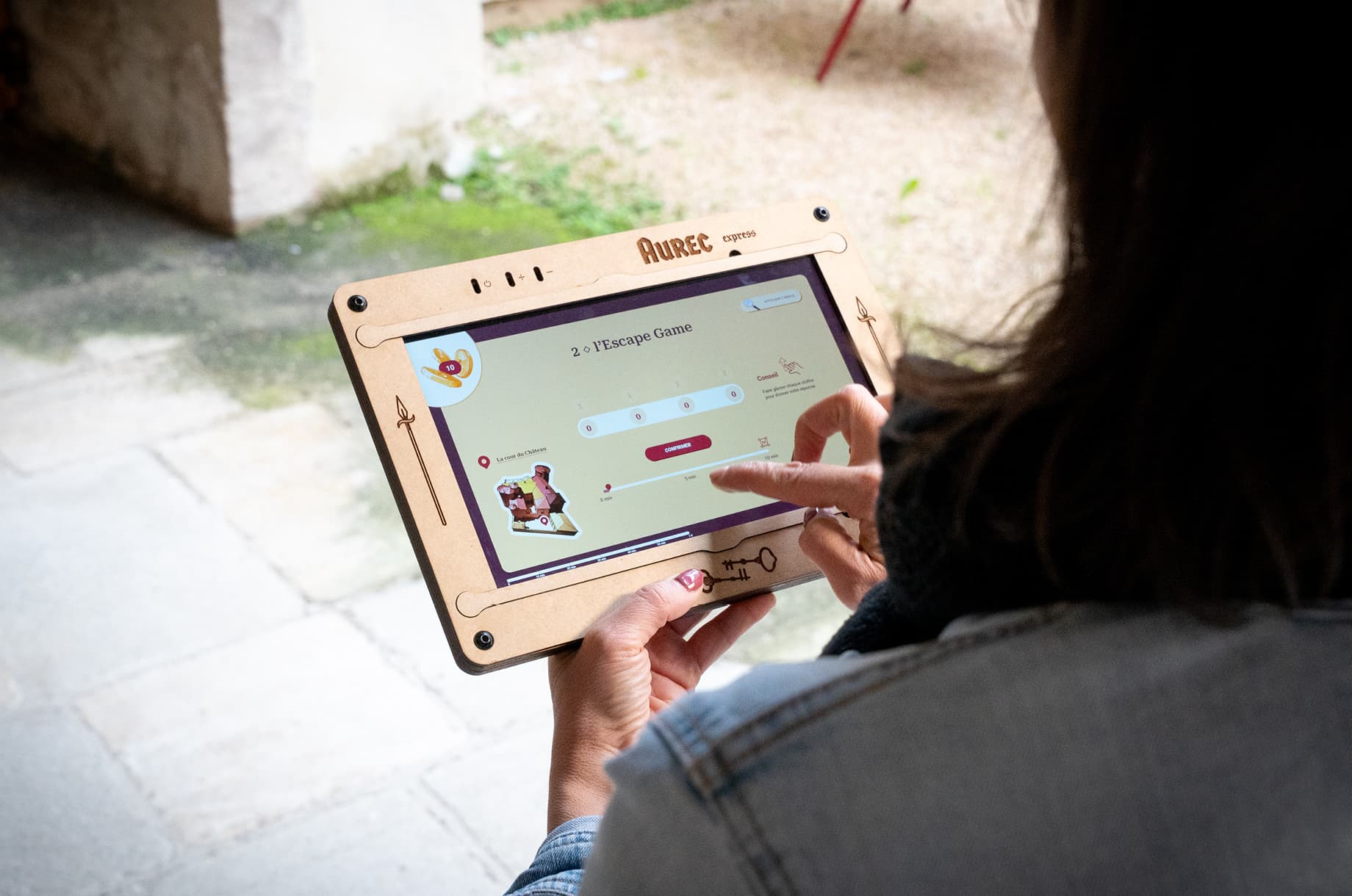 Les Rives d’Aurec, société chargée d’animer le Château d’Aurec à travers son tiers lieu incluant un musée, un espace de séminaires, un coworking et un fablab, ont initié un parcours de visite interactif autour du château, dans le bourg médiéval et en interne, via un simple questionnaire Google. J’ai eu l’opportunité d’approfondir cette activité en développant une application pour tablette, remise aux utilisateurs durant leur visite. Le parcours, qui se déroule en plusieurs temps, inclut une visite et des questions autour du patrimoine, entrecoupées d’épreuves sur place dans la cour du château, avec du mobilier dédié faisant appel à des compétences d’écoute, de réflexion et de logique. J’ai travaillé en interne avec les équipes pour élaborer et optimiser les épreuves et la mécanique de jeu, puis j’ai réalisé l’application qui guide l’utilisateur pas à pas avec des illustrations, des explications et des indices.
