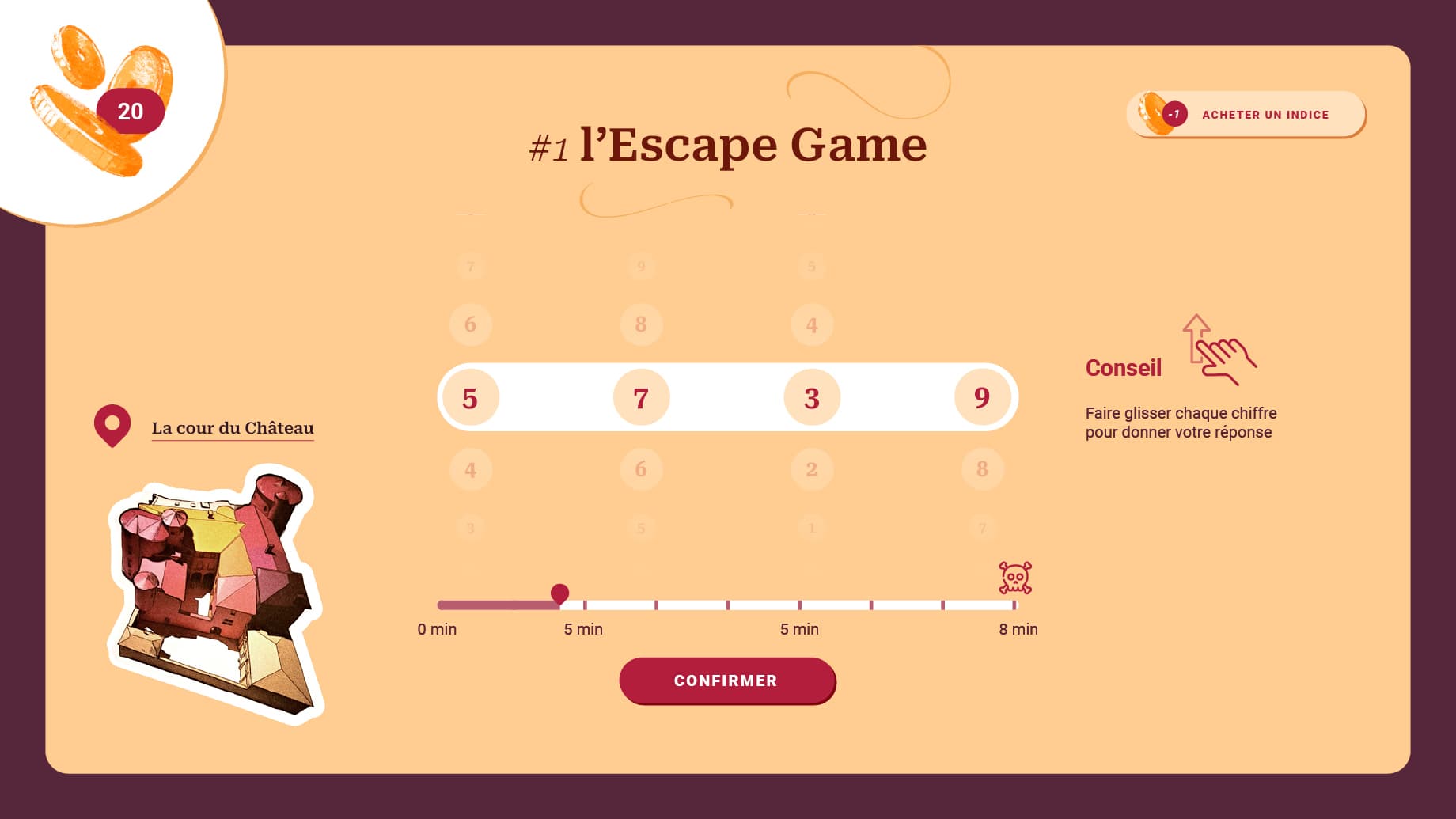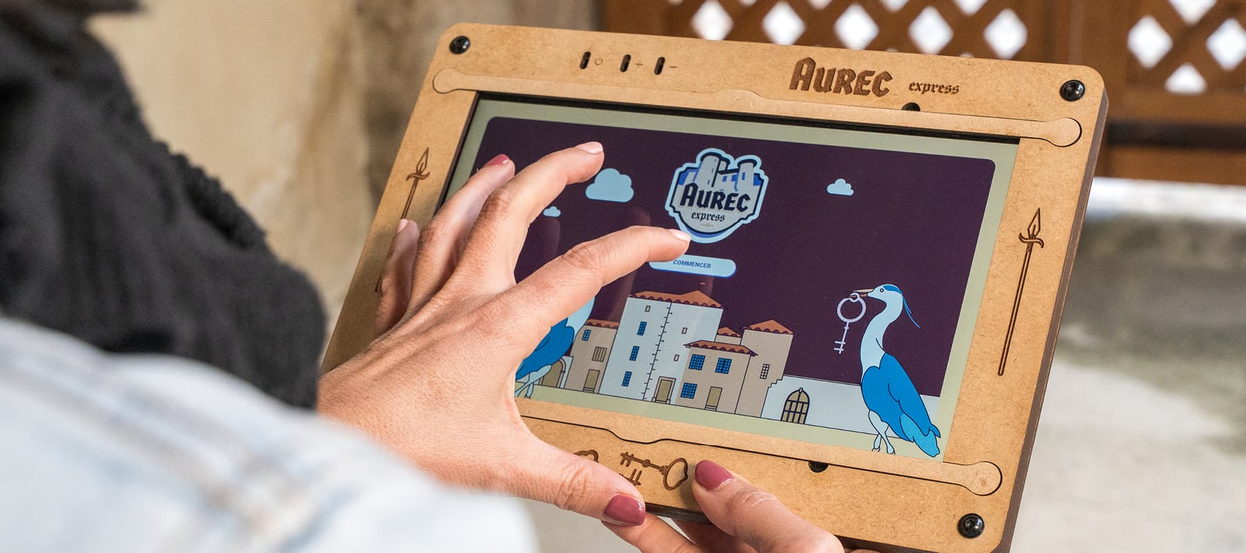 Les Rives d’Aurec, société chargée d’animer le Château d’Aurec à travers son tiers lieu incluant un musée, un espace de séminaires, un coworking et un fablab, ont initié un parcours de visite interactif autour du château, dans le bourg médiéval et en interne, via un simple questionnaire Google. J’ai eu l’opportunité d’approfondir cette activité en développant une application pour tablette, remise aux utilisateurs durant leur visite. Le parcours, qui se déroule en plusieurs temps, inclut une visite et des questions autour du patrimoine, entrecoupées d’épreuves sur place dans la cour du château, avec du mobilier dédié faisant appel à des compétences d’écoute, de réflexion et de logique. J’ai travaillé en interne avec les équipes pour élaborer et optimiser les épreuves et la mécanique de jeu, puis j’ai réalisé l’application qui guide l’utilisateur pas à pas avec des illustrations, des explications et des indices.